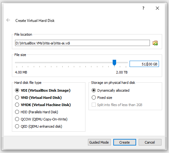 Click on the create button, and the settings for the virtual hard disk will be presented. Select 512GB, which