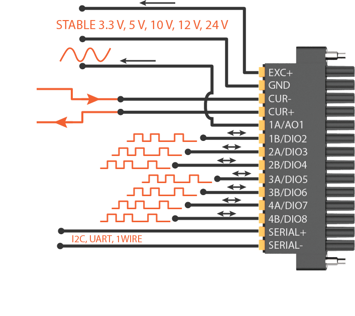MonoDAQ MonoDAQ-U-X Universal DAQ for IoT Development can be a 1-channel strain gauge amplifier, 4-channel thermocouple interface, or 8-channel voltage input with a single click of a button. MonoDAQ MonoDAQ-U-X is stackable with up to 16+ devices and features eight voltage inputs, four thermocouple inputs, and eight DIO pins. The device is housed in robust aluminum housing with a push-in front wire terminal and low-noise sensor excitation.