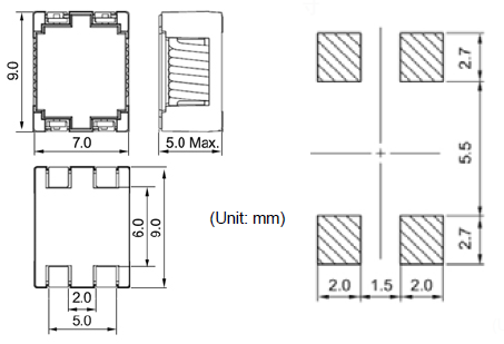 2 线 SMD 扼流线圈额定直流电流为 5.0A,符合 AEC-Q200
