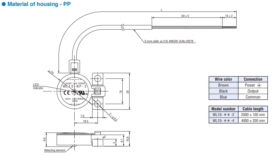 Nidec Components WL10 Liquid Leak Sensors can detect leakage without a douser and additional amplifying circuit. The WL10 sensors include an LED and a partial discharge (PD) detector inside. The light emitted from the LED is reflected by the prism, received by the PD, and converted to current. Nidec WL10 Liquid Leak Sensors feature PFA casing available for detecting leakage of corrosive liquid and are operable in various areas by unique optical technology. This optical technology does not require a douser and detects liquid leakage with high precision and quickness. The liquid leak sensors operate from 12VDC to 24VDC supply voltage range and -10°C to +60°C temperature range. Typical applications include semiconductor production lines, industrial equipment, pneumatic equipment, medical devices, analyzers, and data centers.Features