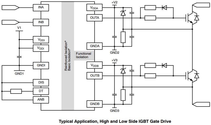 - ANB功能,可灵活地将驱动器设置为采用单输入信号工作的半桥驱动器